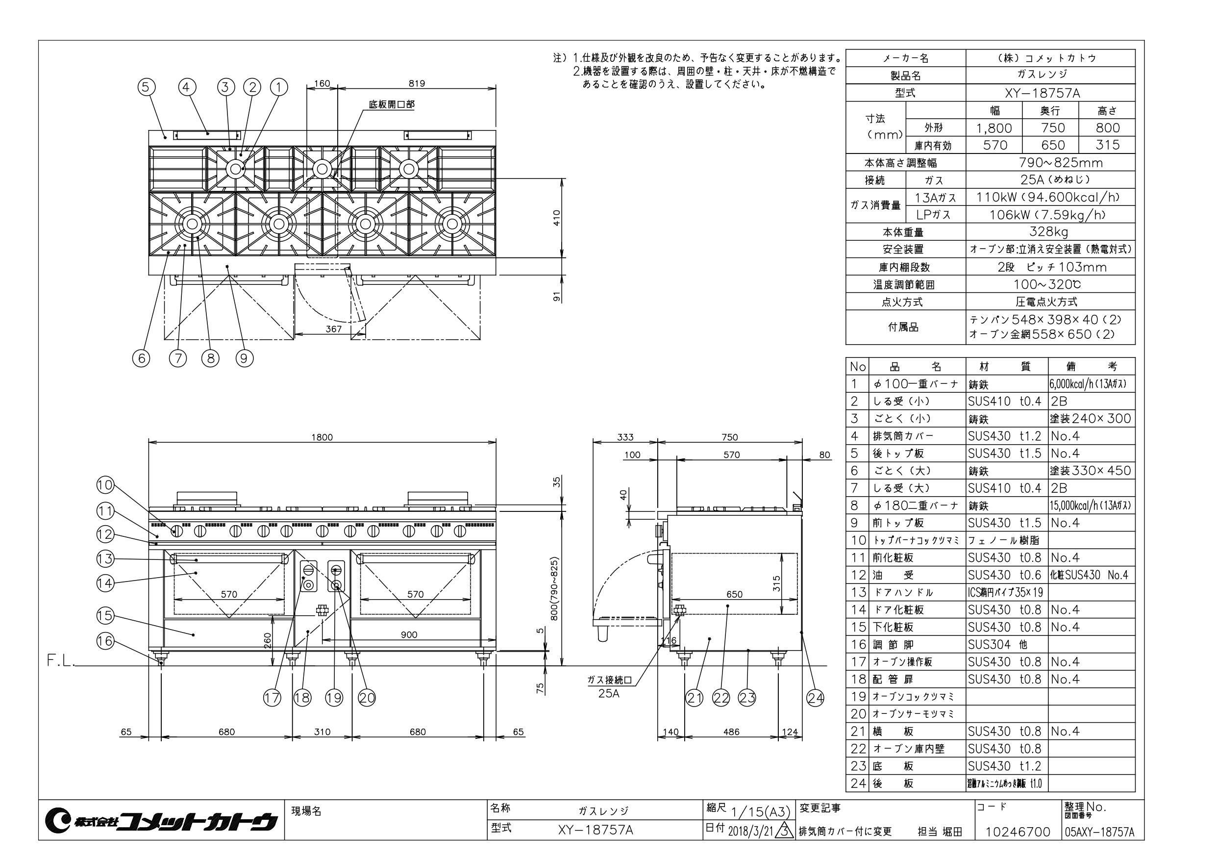 特記事項:トップバーナー個数:2重バーナ 直径180(15,000kcal/h) 4個、1重バーナ 直径100(6,000kcal/h) 3個