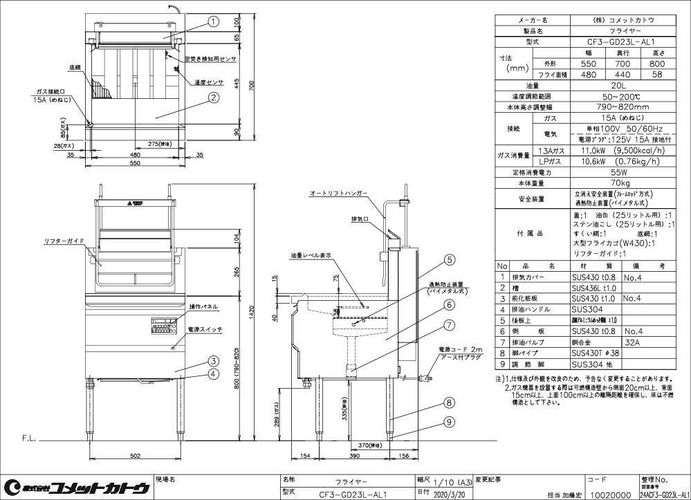 商品名:コメットカトウ ガスフライヤー オイルセービングフライヤーCF3-GD23L