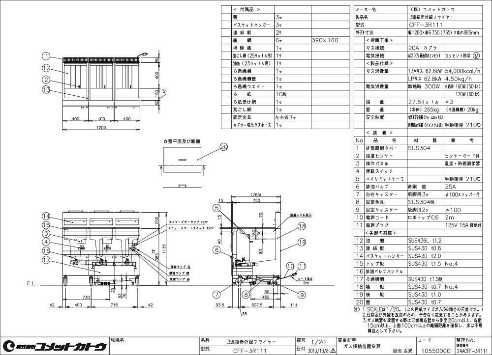 CFF-3R111 【コメットカトウ】 三連結赤外線フライヤー 27.5L×3 3槽式 幅1200×奥行765×高さ885(mm)