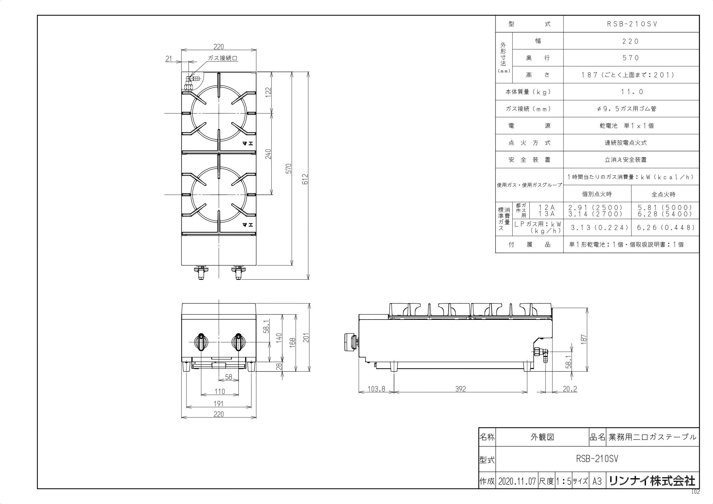 商品名:業務用二口ガステーブル RSB-210SV 幅220×奥行570×高さ187 (mm)(ごとく含み201)