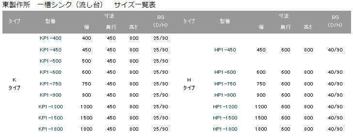 東製作所 一槽シンク(流し台) サイズ一覧表