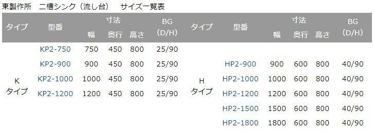 東製作所 二槽シンク(流し台) サイズ一覧表