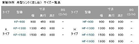 東製作所 舟型シンク(流し台) サイズ一覧表