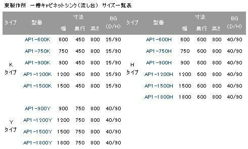 東製作所 一槽キャビネットシンク(流し台) サイズ一覧表