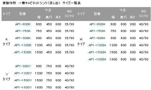 東製作所 一槽キャビネットシンク(流し台) サイズ一覧表