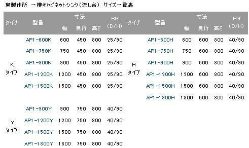 東製作所 一槽キャビネットシンク(流し台) サイズ一覧表