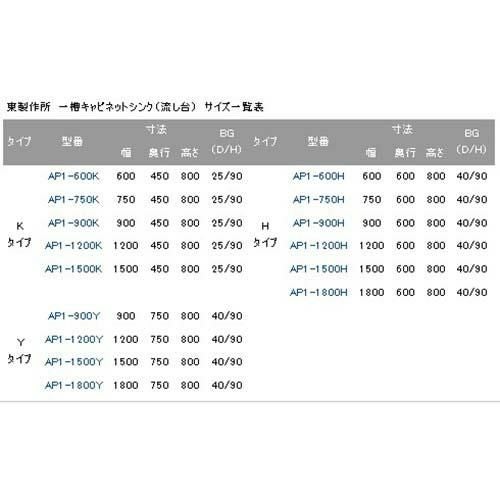 AP1-1500Y 【東製作所】 一槽キャビネットシンク 幅1500×奥行750×高さ800(mm)
