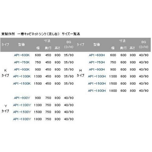 AP1-1800Y 【東製作所】 一槽キャビネットシンク 幅1800×奥行750×高さ800(mm)