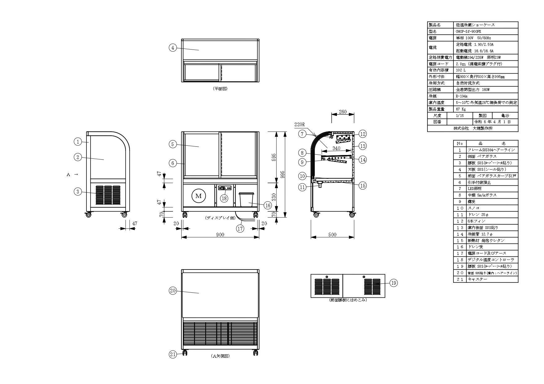 OHGP-Sf-900FK 大穂製作所 低温冷蔵ショーケース(ペアガラスタイプ)前引戸 背面壁寄せ 幅900×奥行500×高さ995(mm)