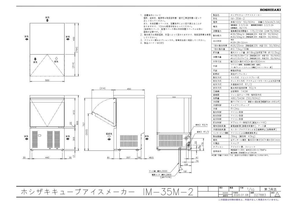 【限定価格】IM-35M-2【ホシザキ】製氷機35kg 幅500×奥行450×高さ800mm 単相100V ※設置必須(別途見積)