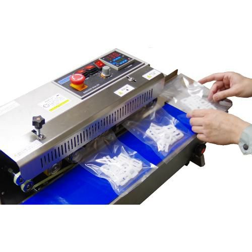 上下ヒート方式ですので、ガゼットタイプの袋、厚手のアルミの袋もばっちりです。・1000パック以上も短時間で仕上がりますし、仕上がりもきれいです。・シール温度、コンベアの速さ、シール圧が調整可能なので、さまざまな袋に対応できます。