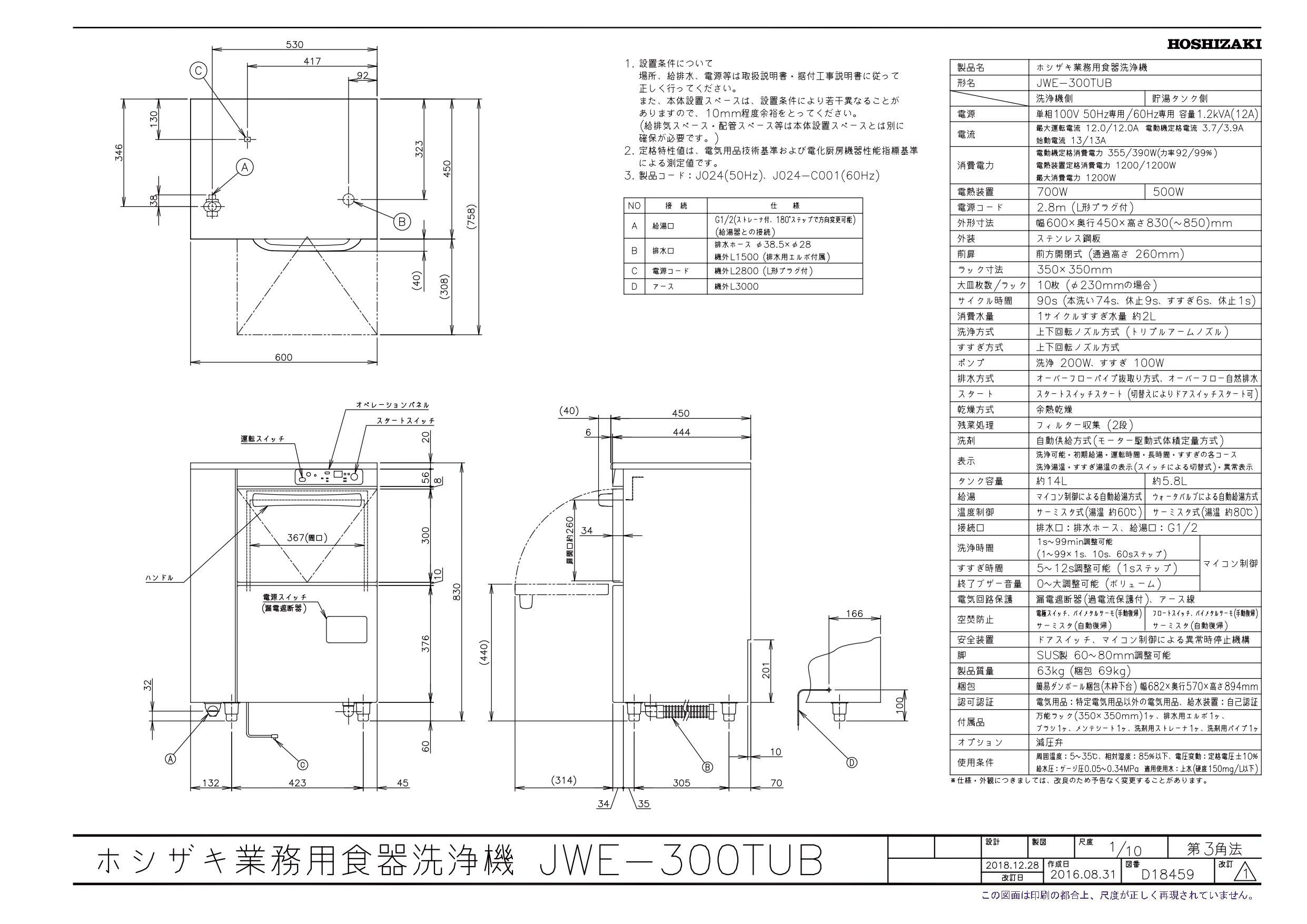 商品名:食器洗浄機(アンダーカウンタータイプ)JWE-300TUB 600×450×830(mm) 単相100V