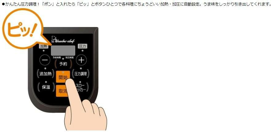 ●かんたん圧力調理!「ポン」と入れたら「ピッ」とボタンひとつで各料理にちょうどいい加熱・加圧に自動設定。うま味をしっかり引き出してくれます。