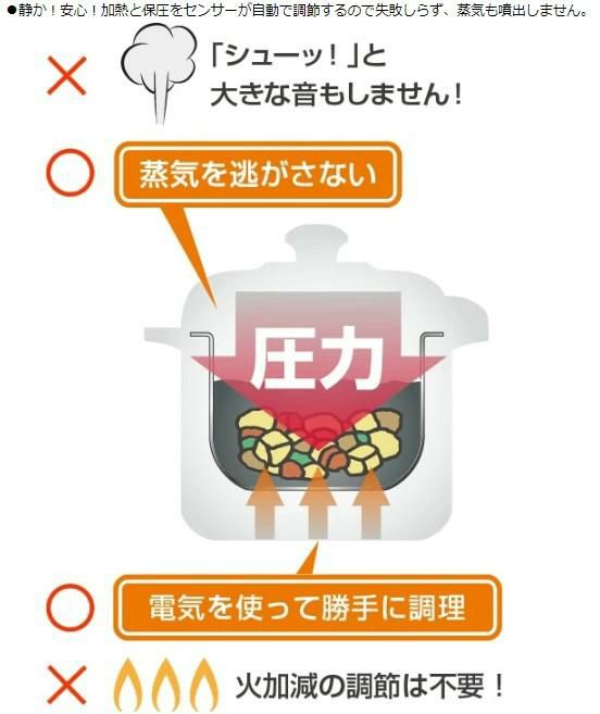 ●静か!安心!加熱と保圧をセンサーが自動で調節するので失敗しらず、蒸気も噴出しません。