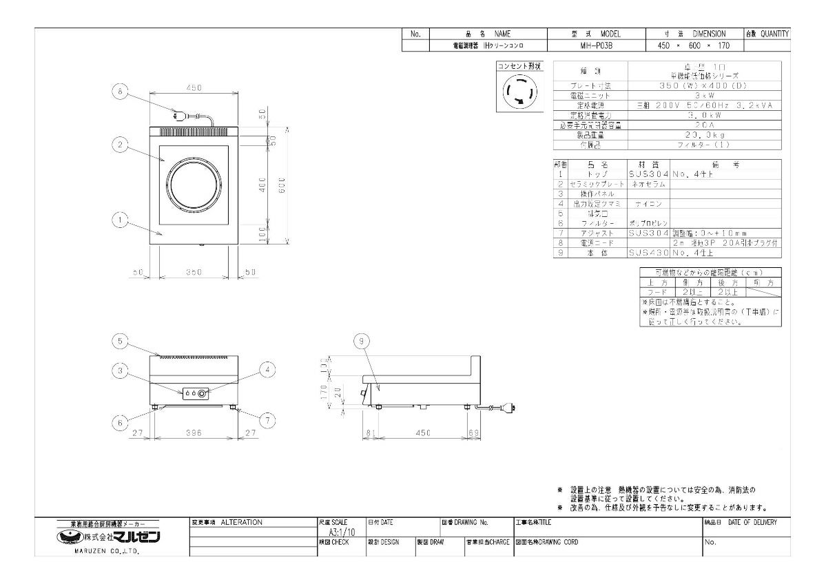 MIH-P03B 【マルゼン】IHクリーンコンロ 幅450×奥行600×高さ170mm 三相200V