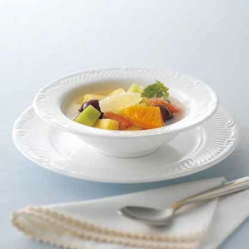 リムのバイアス柄が、白磁全体に広がりの印象を与え、料理を中心に引き立てます。