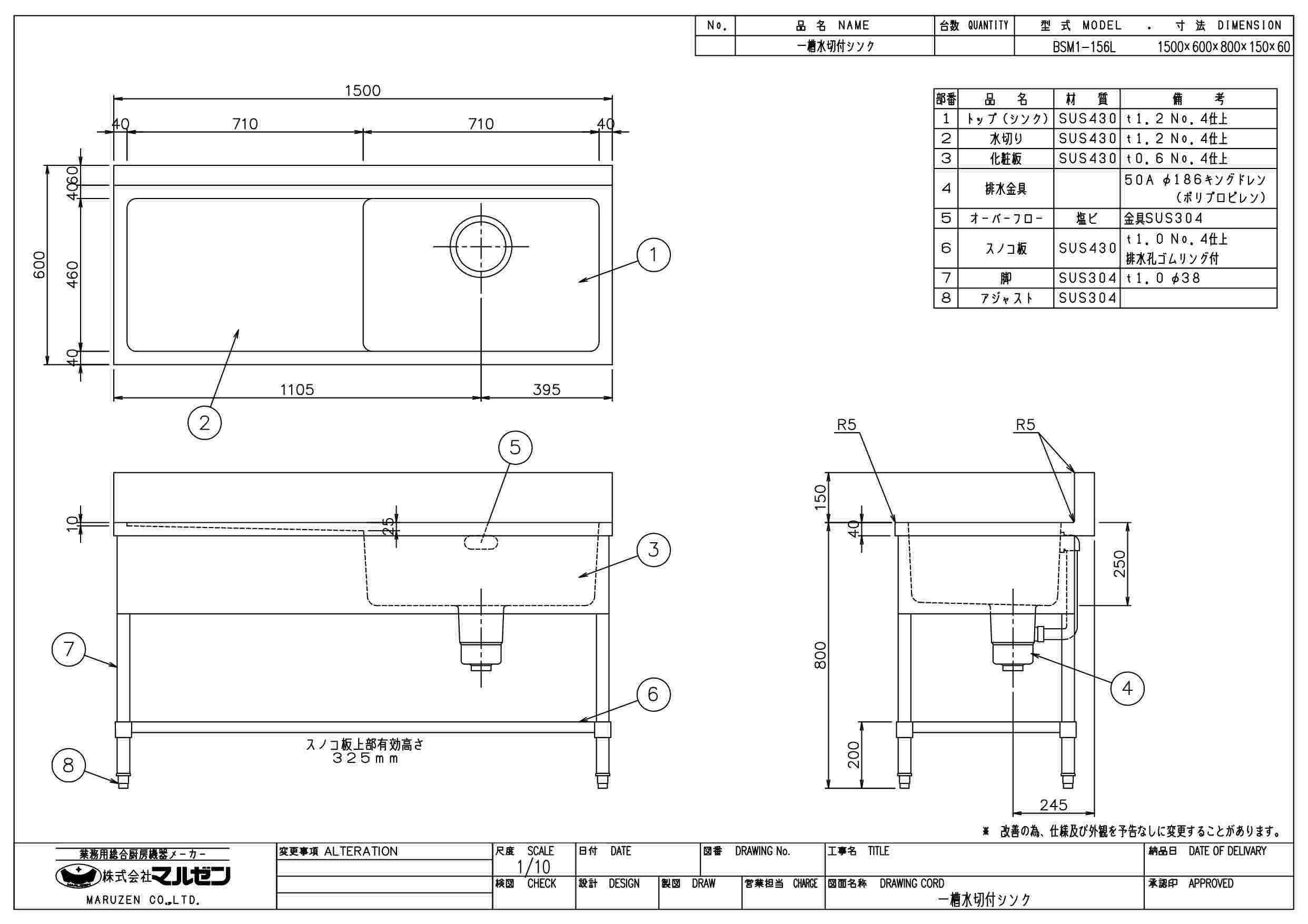 【3月末までのお届け分限定価格】BSM1-156L 【マルゼン】 一槽水切付シンク 左水切り 幅1500×奥行600×高さ800mm