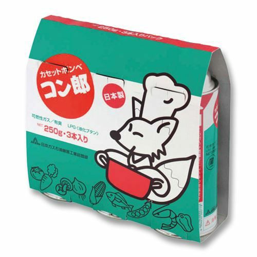 きつねのシェフ・コン郎くんのイラストが目印のカセットボンベ3本セットです。