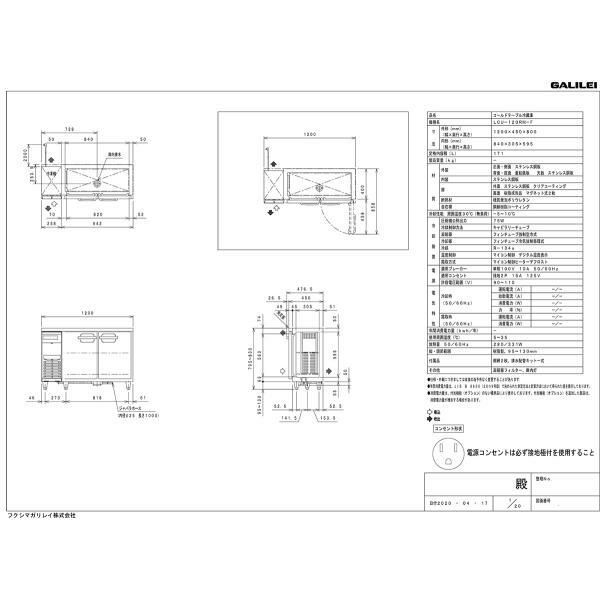 LCU-120RM2-F【フクシマガリレイ】横型超薄型冷蔵庫・センターフリー 幅1200×奥行450×高さ800 単相100V