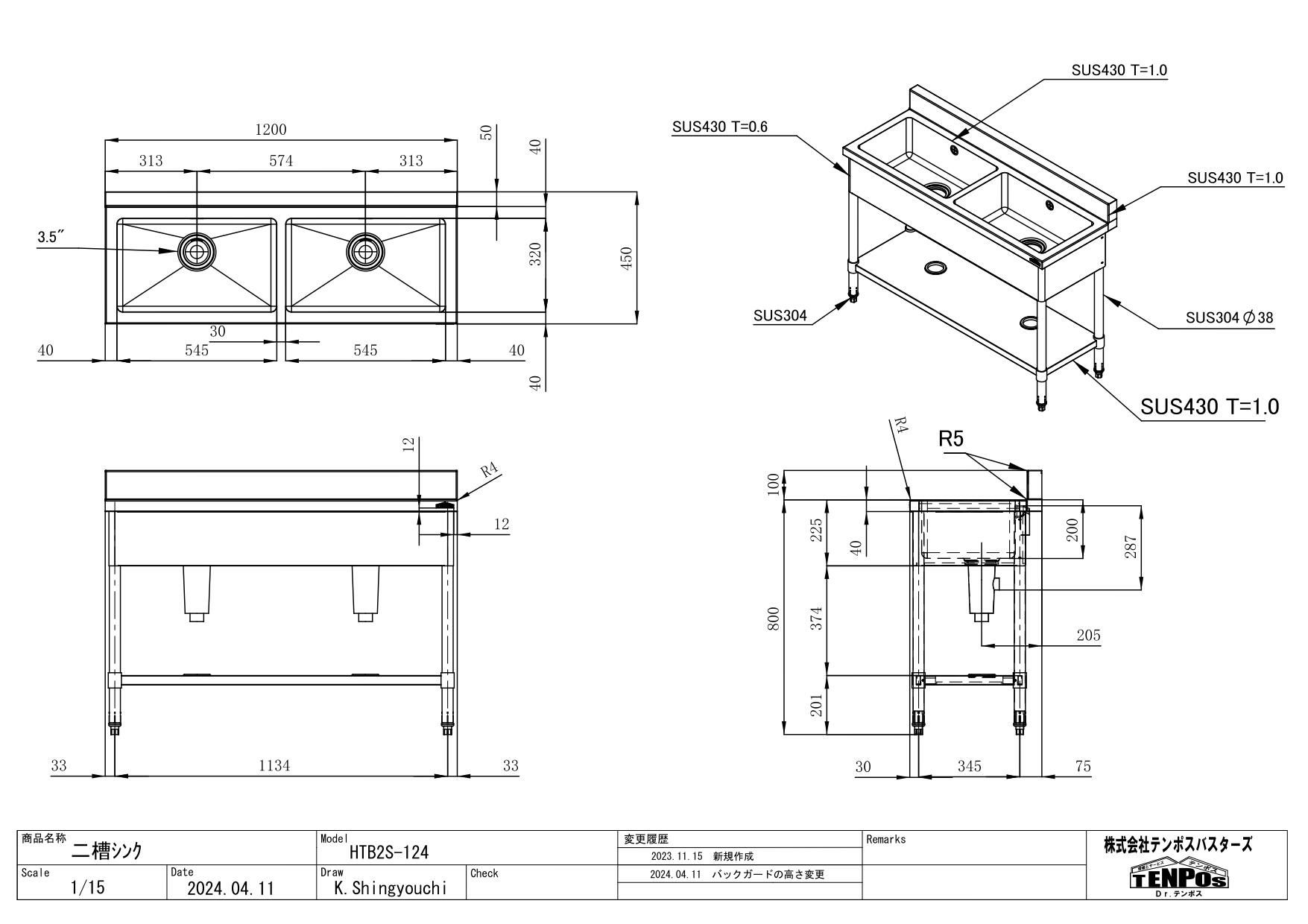 【テンポスオリジナル】【完成品】HTB2S-124 2槽シンク 幅1200×奥行450×高さ800 バックガード高さ100mm