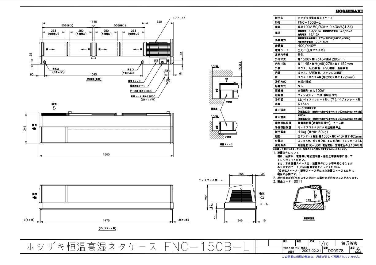 【ホシザキ】恒温高湿ネタケース FNC-150C-L 幅1500×奥行345×高さ280(mm) 単相100V