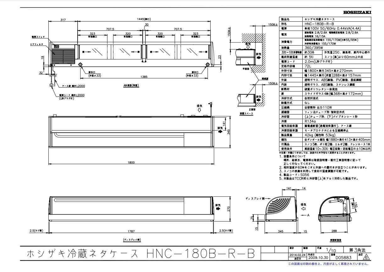 商品名:冷蔵ネタケースHNC-180B-R-B 幅1800×奥行345×高さ270(mm) 単相100