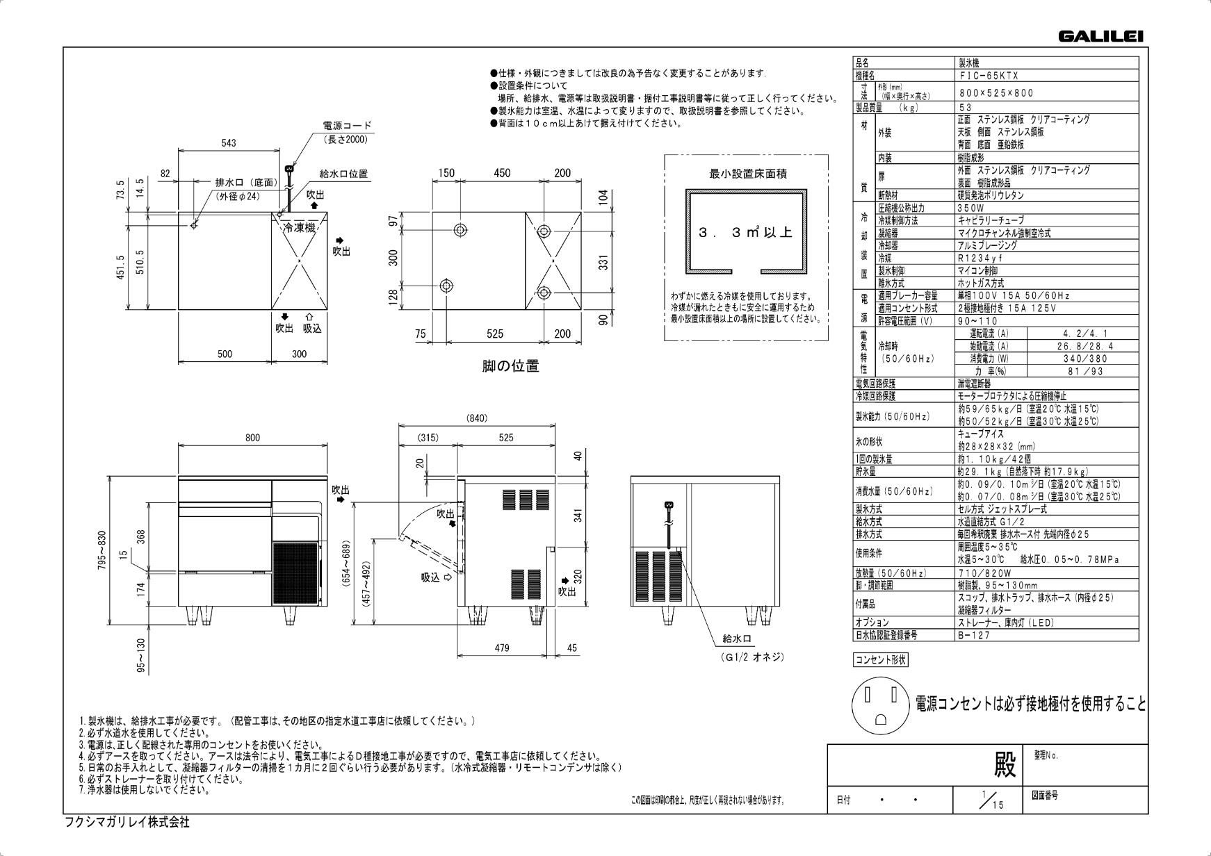 【ノンフロン製氷機入れ替えキャンペーン商品】【フクシマガリレイ】ノンフロン製氷機65kg FIC-65KTX(旧:FIC-A65KT3)幅800×奥行525×高さ800mm 単相100V