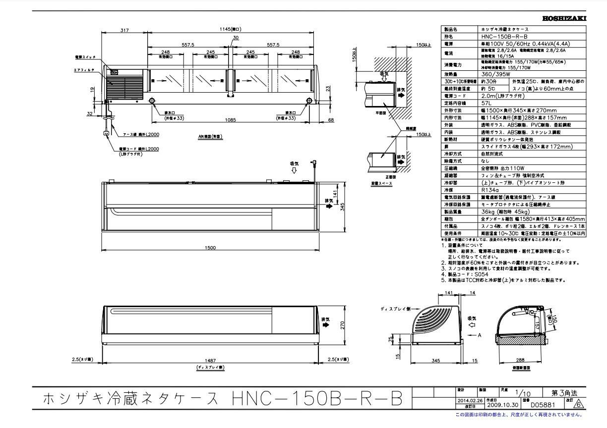 商品名:冷蔵ネタケース 右ユニット HNC-150B-R-B 幅1500×奥行345×高さ270(mm) 単相100