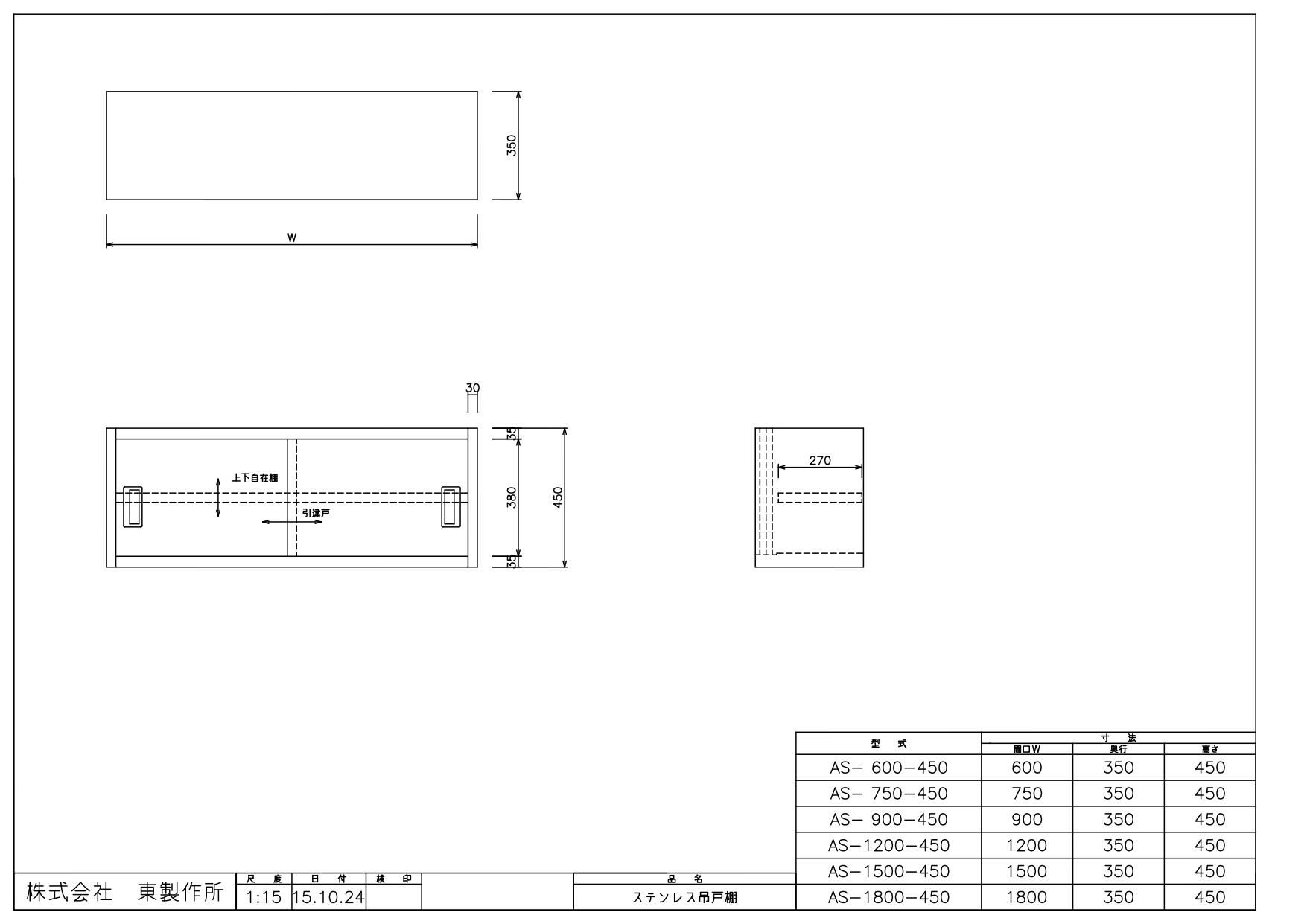 AS-1200-450【東製作所】吊戸棚ステンレス戸 幅1200×奥行350×高さ450mm