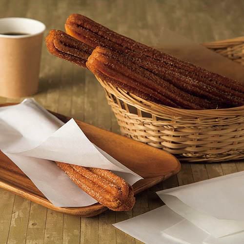耐油性を持たせたチュロス専用の紙袋です。袋上部の切れ込みからチュロスを挿入し、余った部分を巻きつけて使用します。
