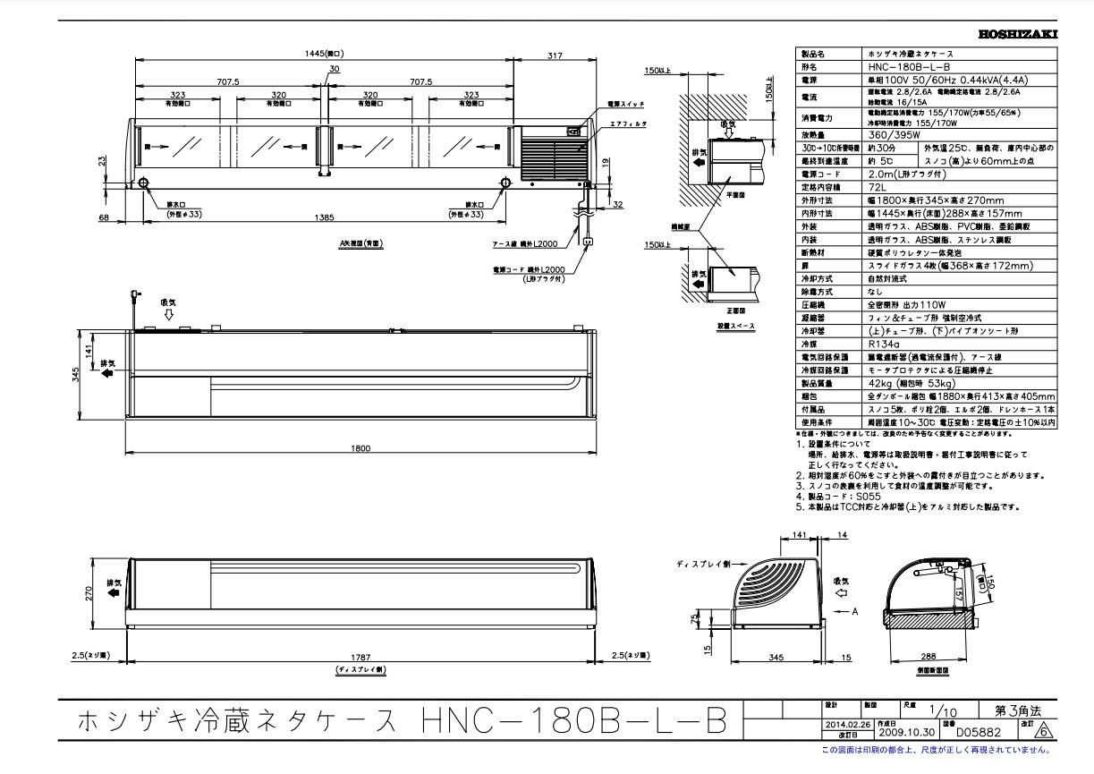 商品名:冷蔵ネタケース HNC-180B-L-B 幅1800×奥行345×高さ270(mm) 単相100V