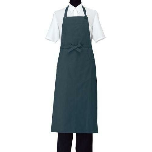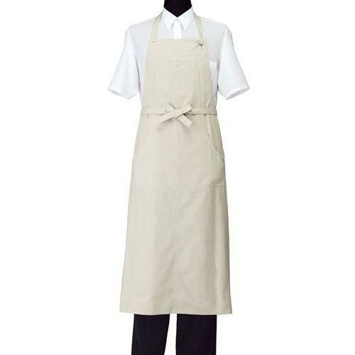 ●綿のナチュラルさとユニフォームの耐久性を合わせ持つナチュラルシリーズ・ソムリエ丈の胸当てエプロン・背当て付き巻きスカートタイプ・前中心に2段のカンガルーポケット・袋布押さえの内側ステッチはナチュラル/シリーズの特徴ラウンドステッチ
