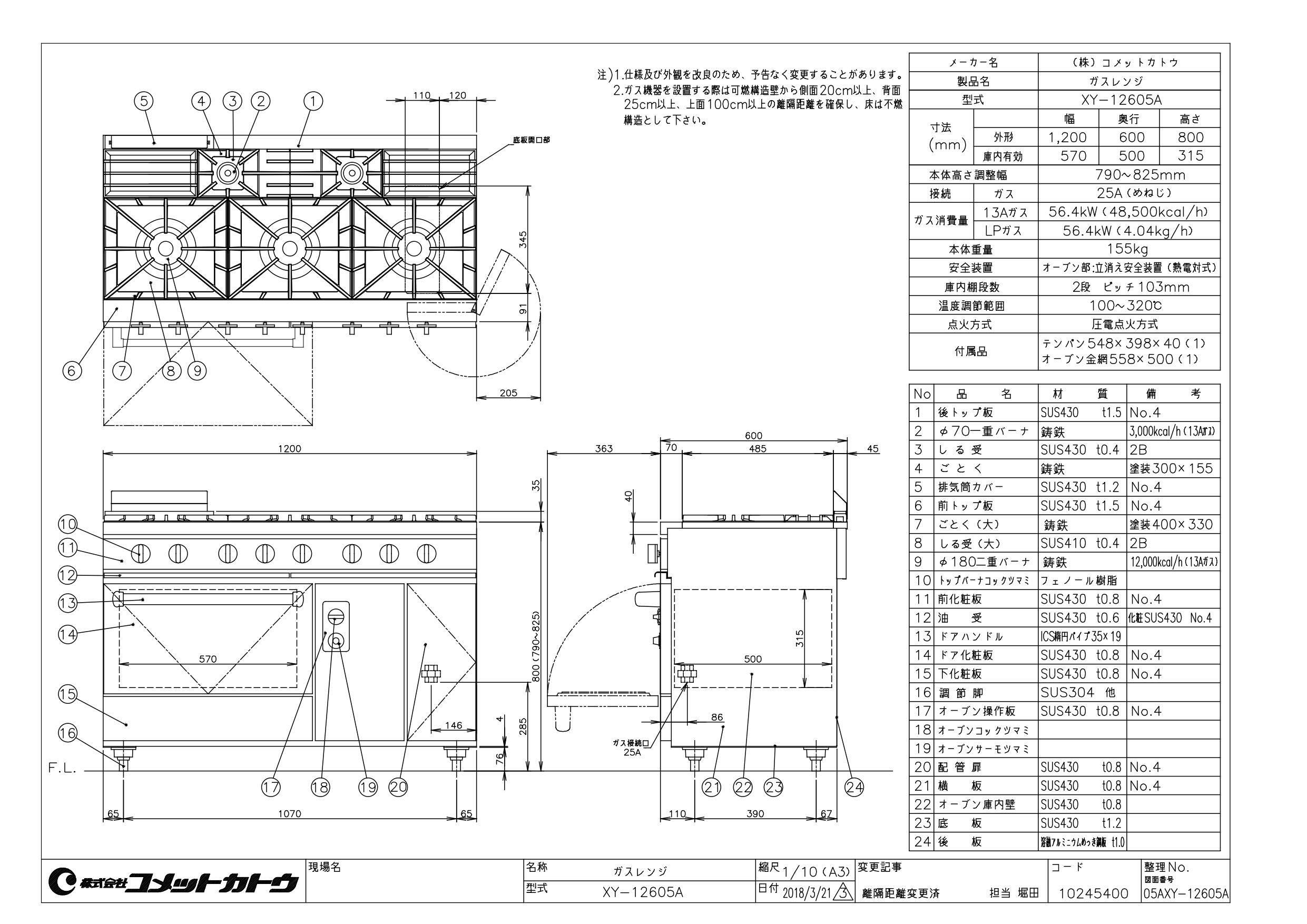 特記事項:トップバーナー個数:2重バーナ 直径180(12,000kcal/h) 3個、1重バーナ 直径70(3,000kcal/h) 2個