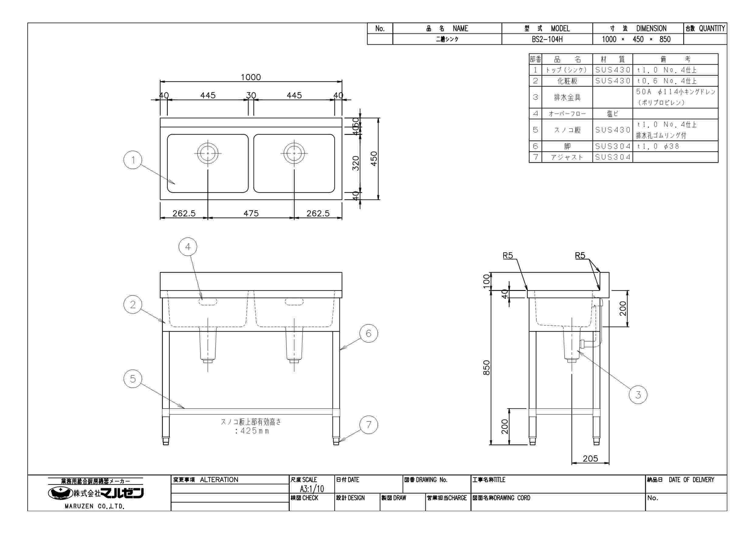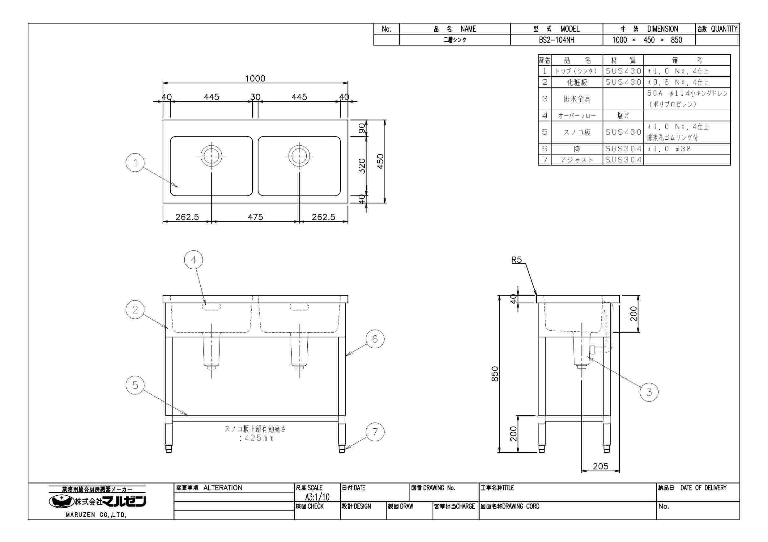 商品名:二槽シンク W1000×D450×H850