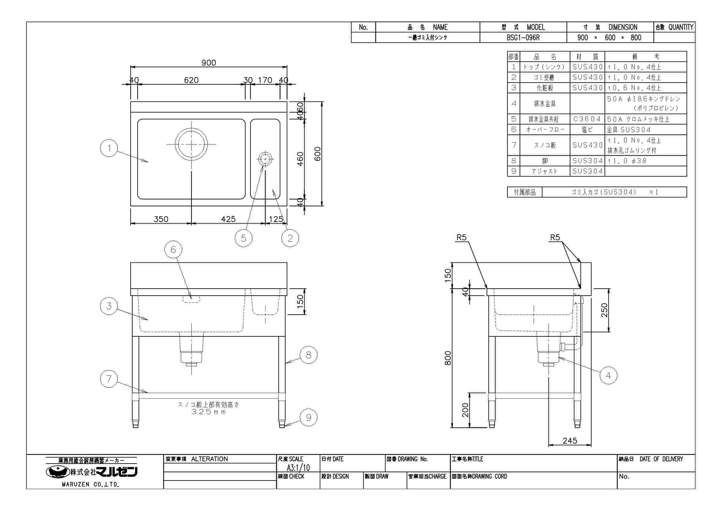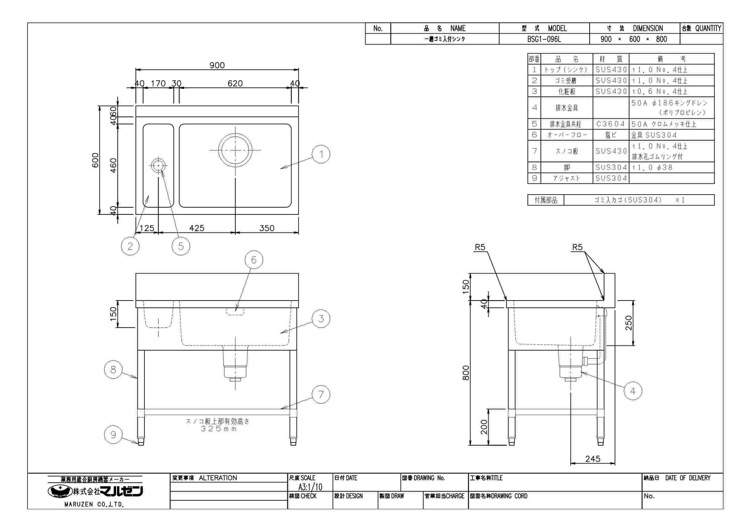 商品名: 一槽ゴミ入付シンク W900×D600×H800