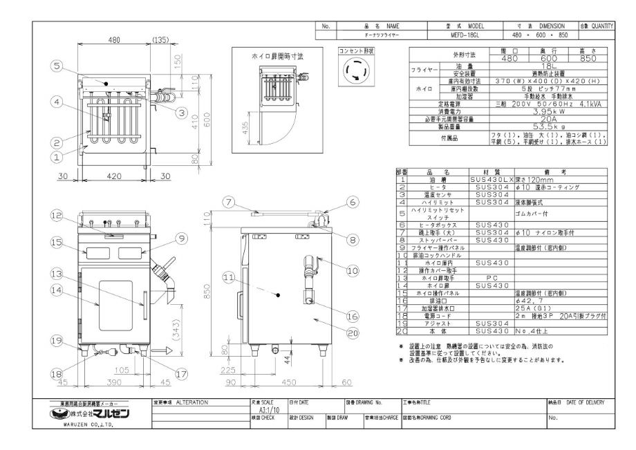 フライヤー:(油量)18L、(安全装置)過熱防止装置