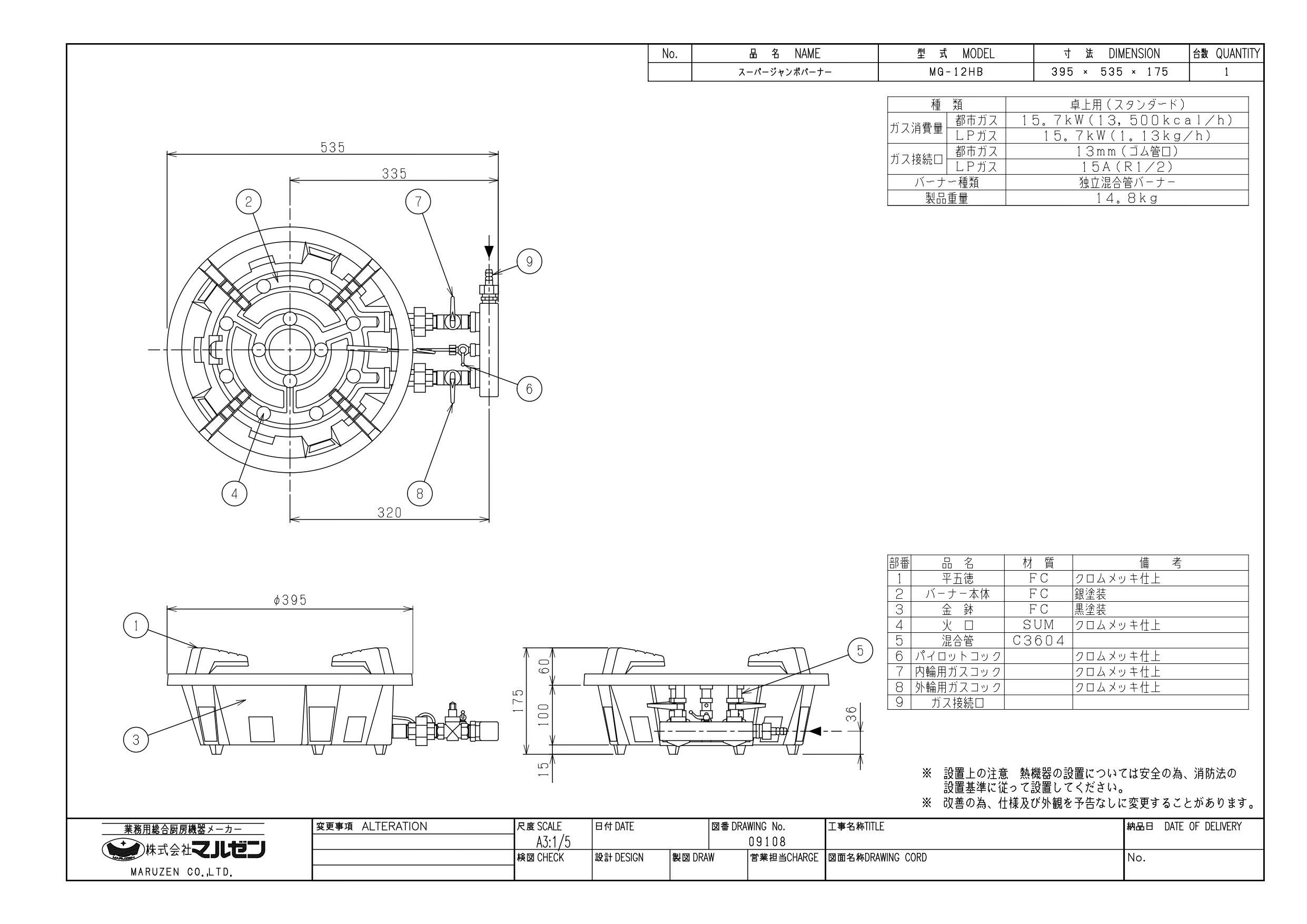 ガス消費量:(都市ガス)15.7kW(13,500kcal/h)、(LPガス)15.7kW(1.13kg/h)
