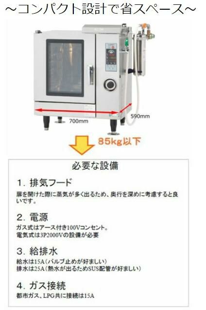 ボイラーが無いため、本体重量はコンベクションオーブンと同等の85kg以下!(業界最軽量)