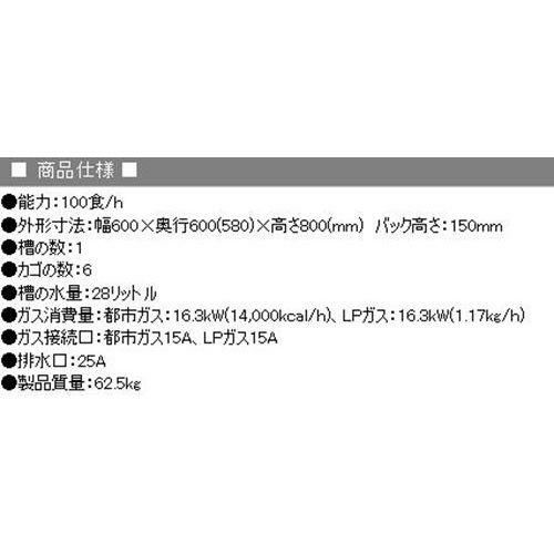 ●能力:100食/h ●外形寸法:幅600×奥行600(580)×高さ800(mm) バック高さ:150mm ●槽の数:1 ●カゴの数:6 ●槽の水量:28L ●ガス消費量:都市ガス:16.3kW(14,000kcal/h)、LPガス:16.3kW(1.17kg/h) ●ガス接続口:都市ガス15A、LPガス15A ●排水口:25A ●製品質量:62.5kg |