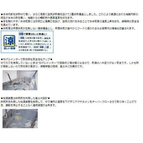 ■給湯装置は排気熱を利用した省エネ設計■ 排気熱を利用した給湯装置を採用して、ゆで槽内の温度を下げずにアクやヌメリをオーバーフローさせて取り除くことができ、運転を停止することなく連続調理が出来ます。