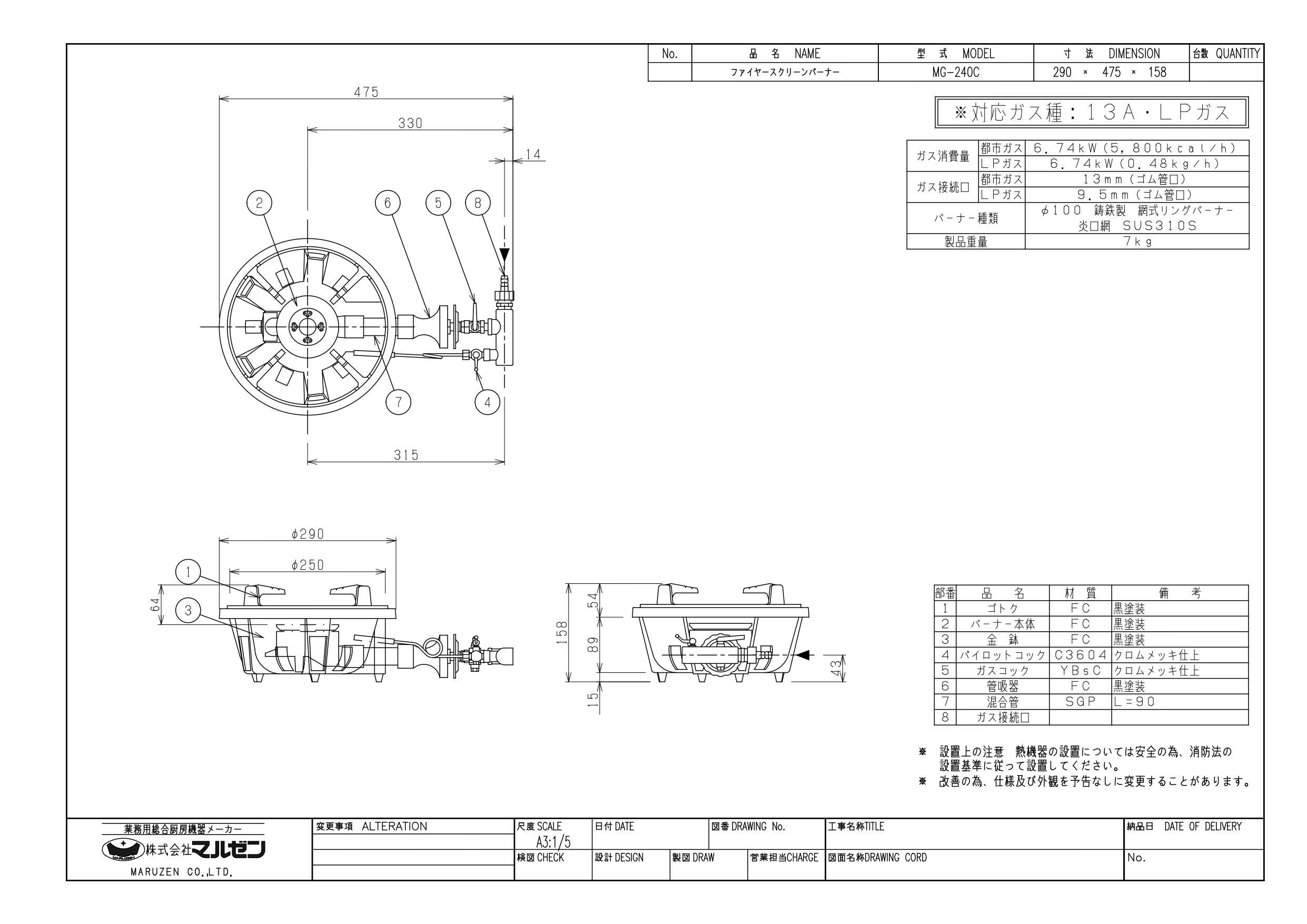 ガス接続:都市ガス 13mm(ゴム管口接続)※13Aのみ / LPガス:9.5mm(ゴム管口接続)