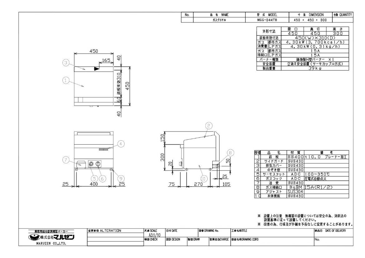 マルゼン ガスグリドル サーモスタット付 MGG-044TB 都市ガス(15A)/プロパンガス(LPG) 幅450×奥行450×高さ300mm
