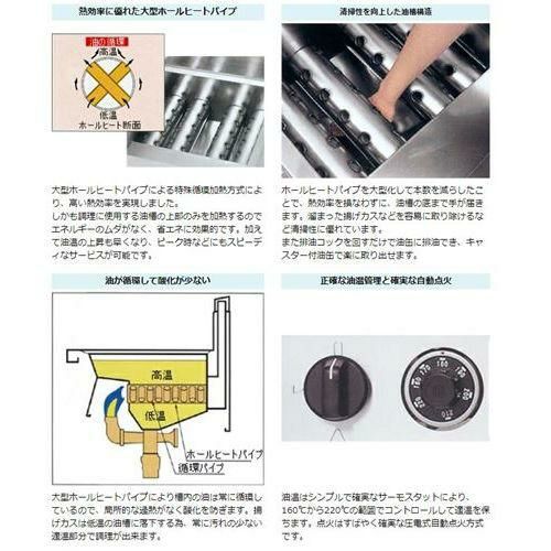 | 大型ホールヒートパイプにより槽内の油は常に循環しているので、局所的な過熱がなく酸化を防ぎます。揚げカスは低温の油槽に落下する為、常に汚れの少ない適温部分で調理が出来ます。 | 油温はシンプルで確実なサーモスタットにより、160℃から220℃の範囲でコントロールして適温を保ちます。点火はすばやく確実な圧電式自動点火方式です。 | |