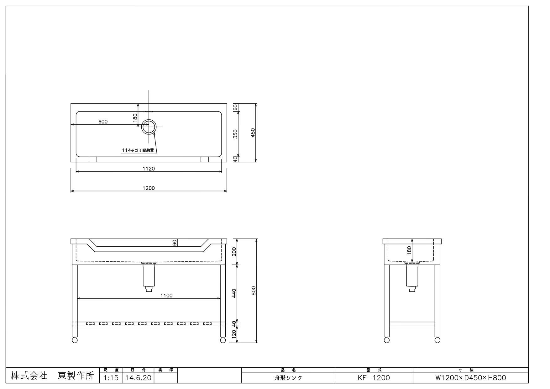 KF-1200【東製作所】舟形シンク 幅1200×奥行450×高さ800mm