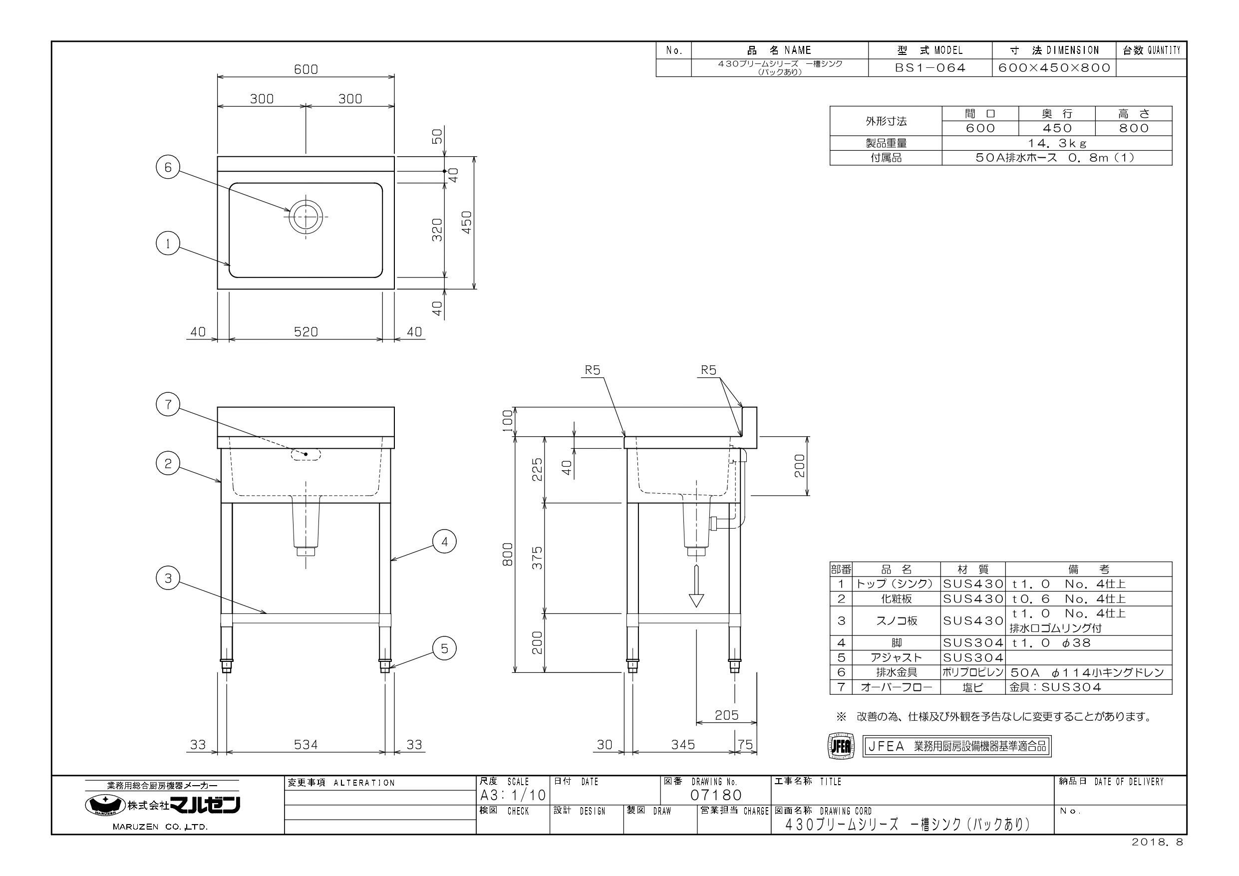 商品名:一槽シンク W600×D450×H800