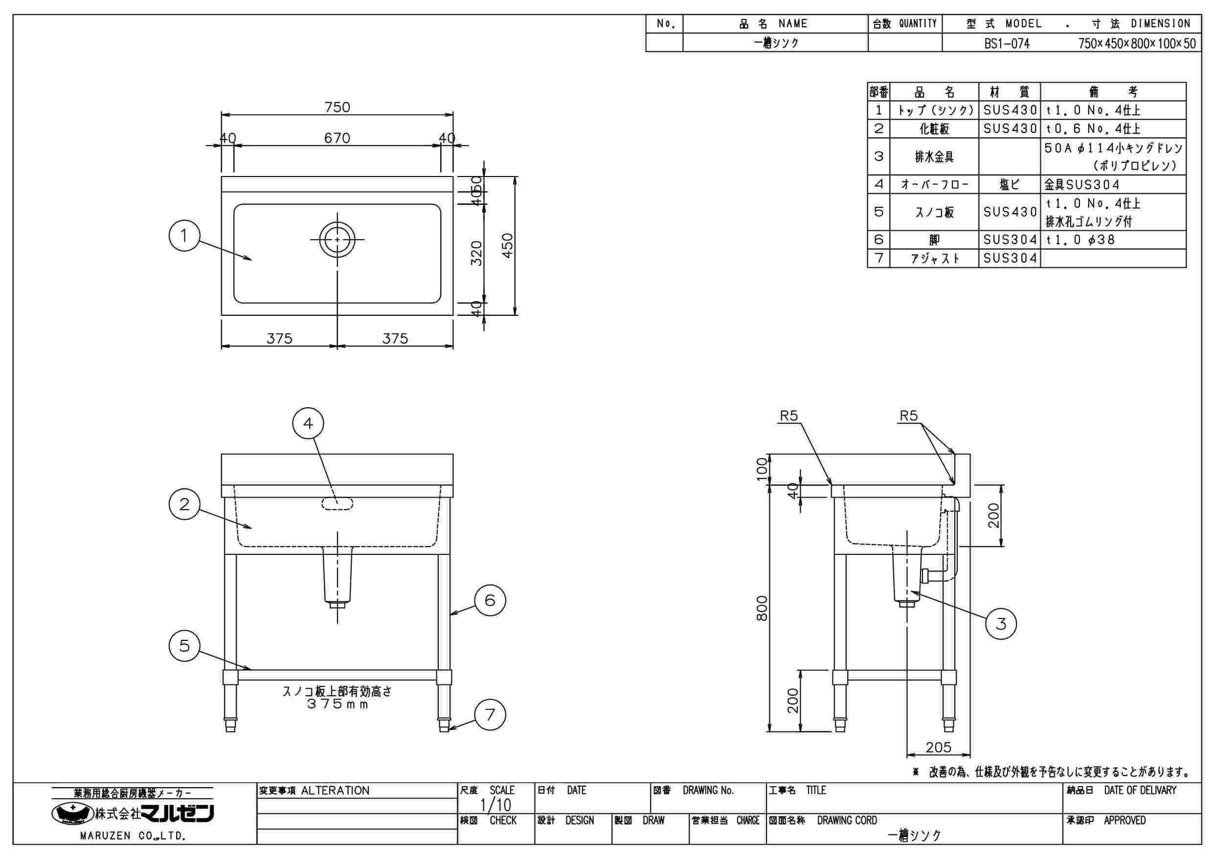 商品名:一槽シンク W750×D450×H800
