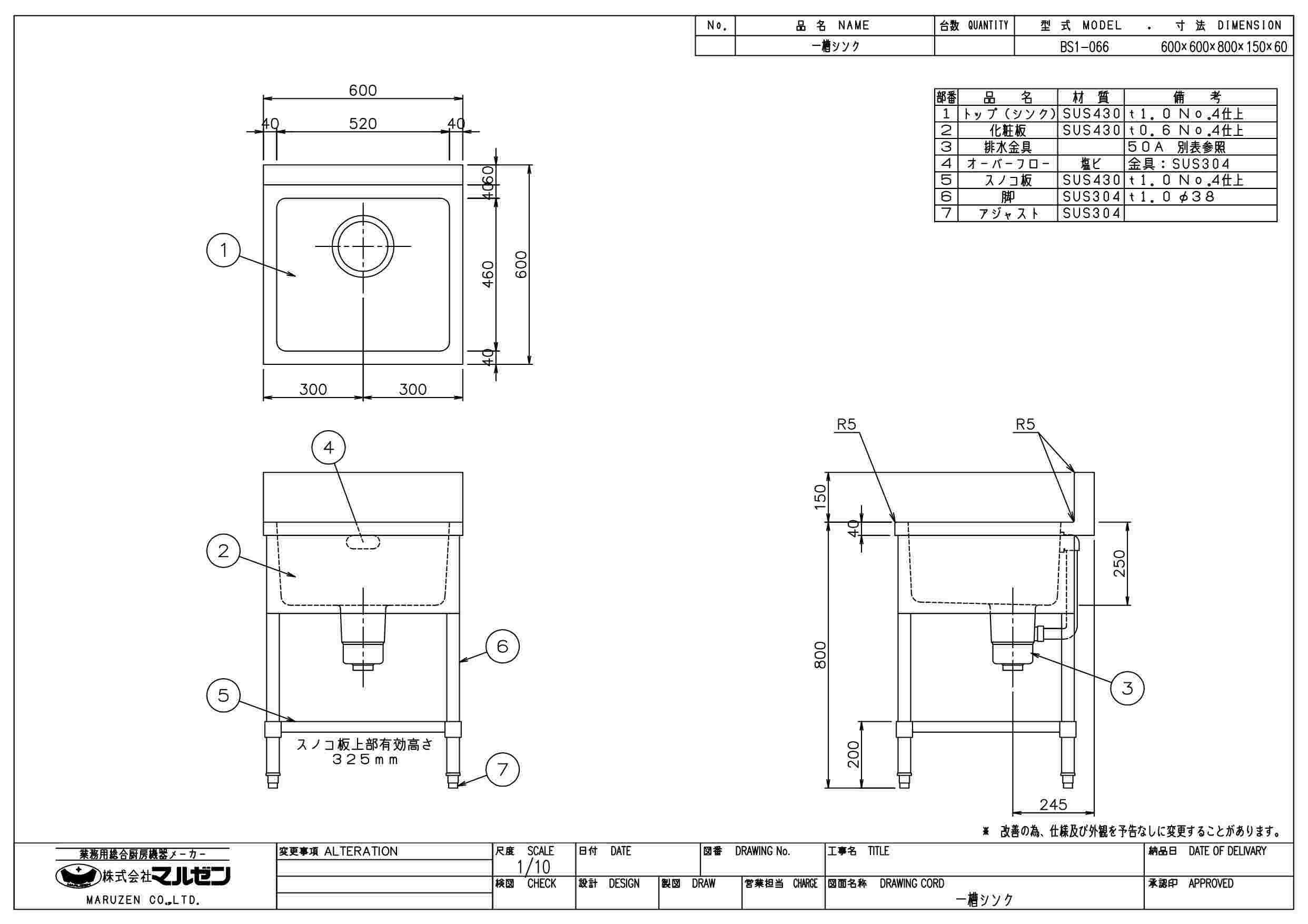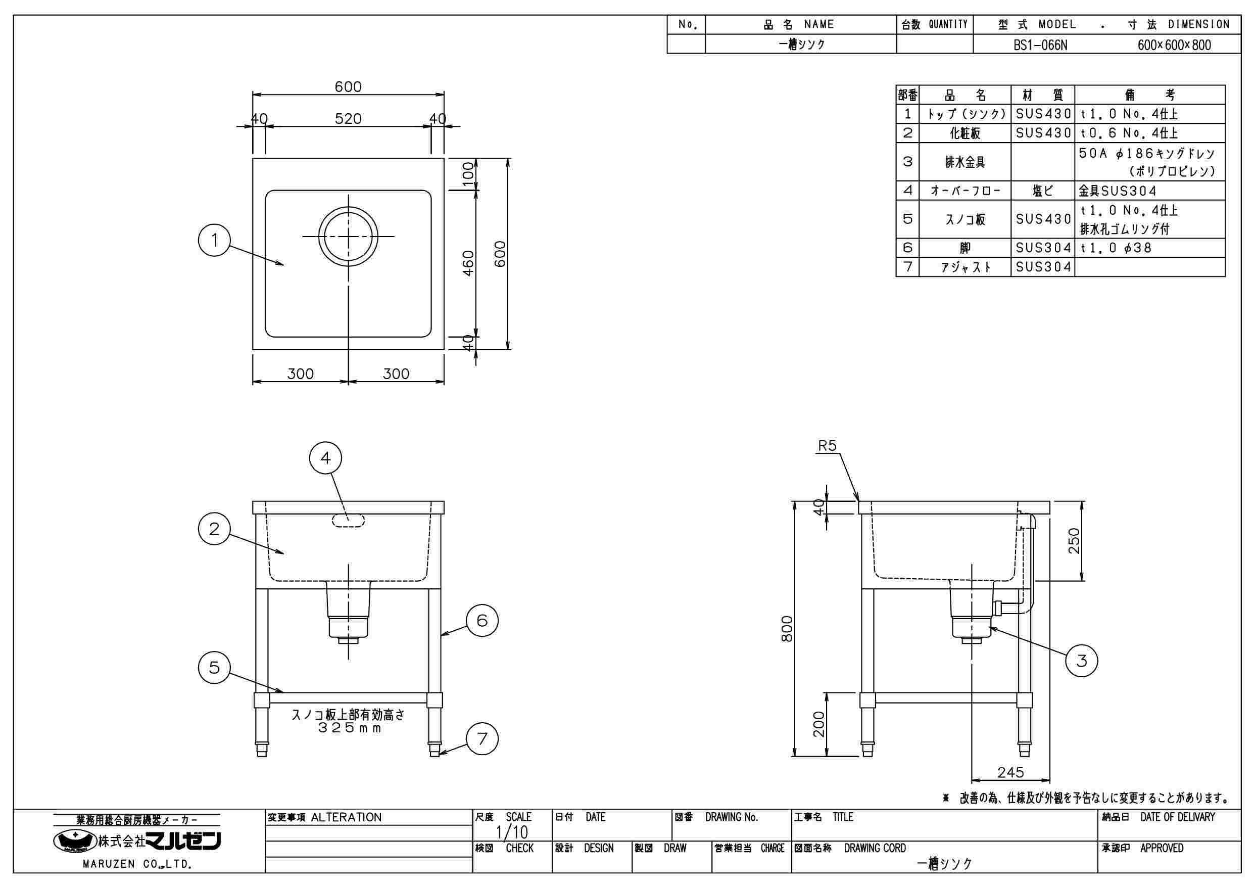 【3月末までのお届け分限定価格】BS1-066,BS1-066N 【マルゼン】 一槽シンク 幅600×奥行600×高さ800mm