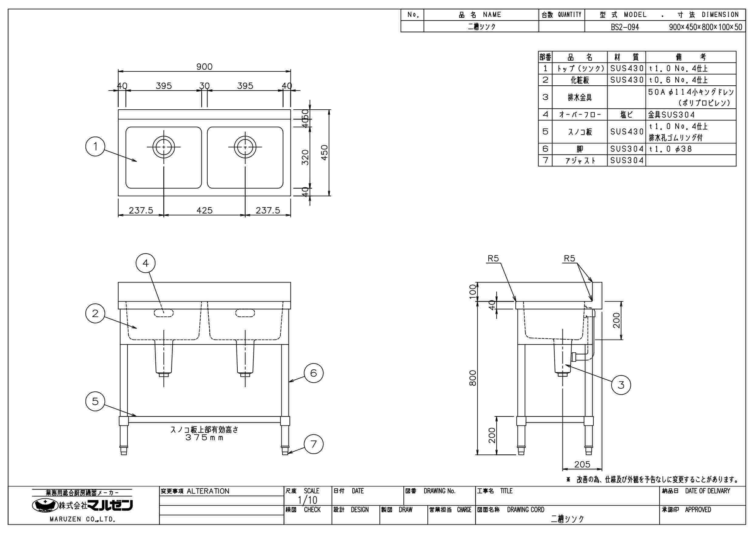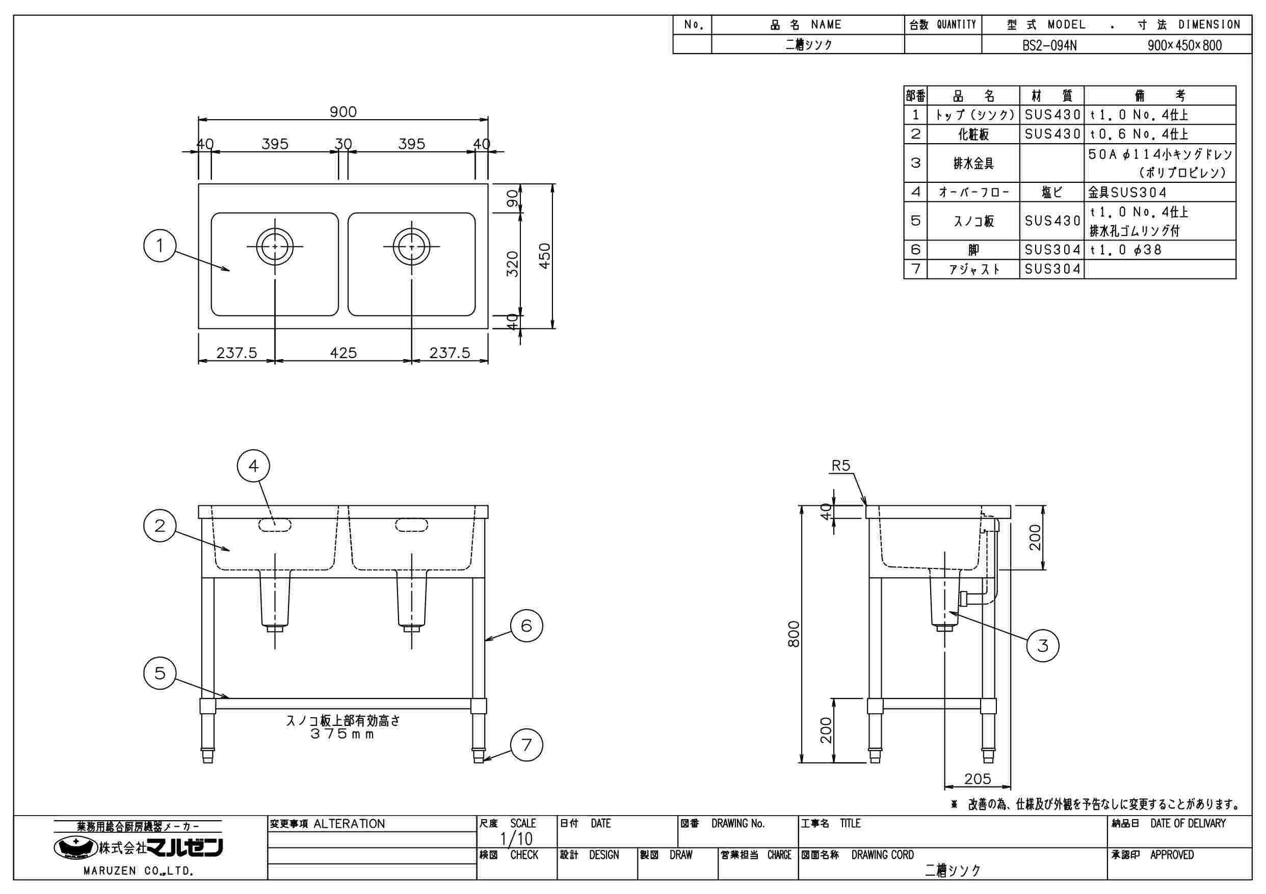 【3月末までのお届け分限定価格】BS2-094, BS2-094N【マルゼン】二槽シンク 幅900×奥行450×高さ800mm