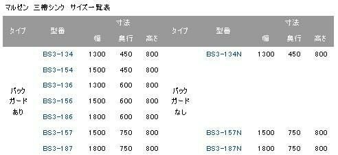 【マルゼン】三槽シンク BS3-134, BS3-134N 幅1300×奥行450×高さ800mm