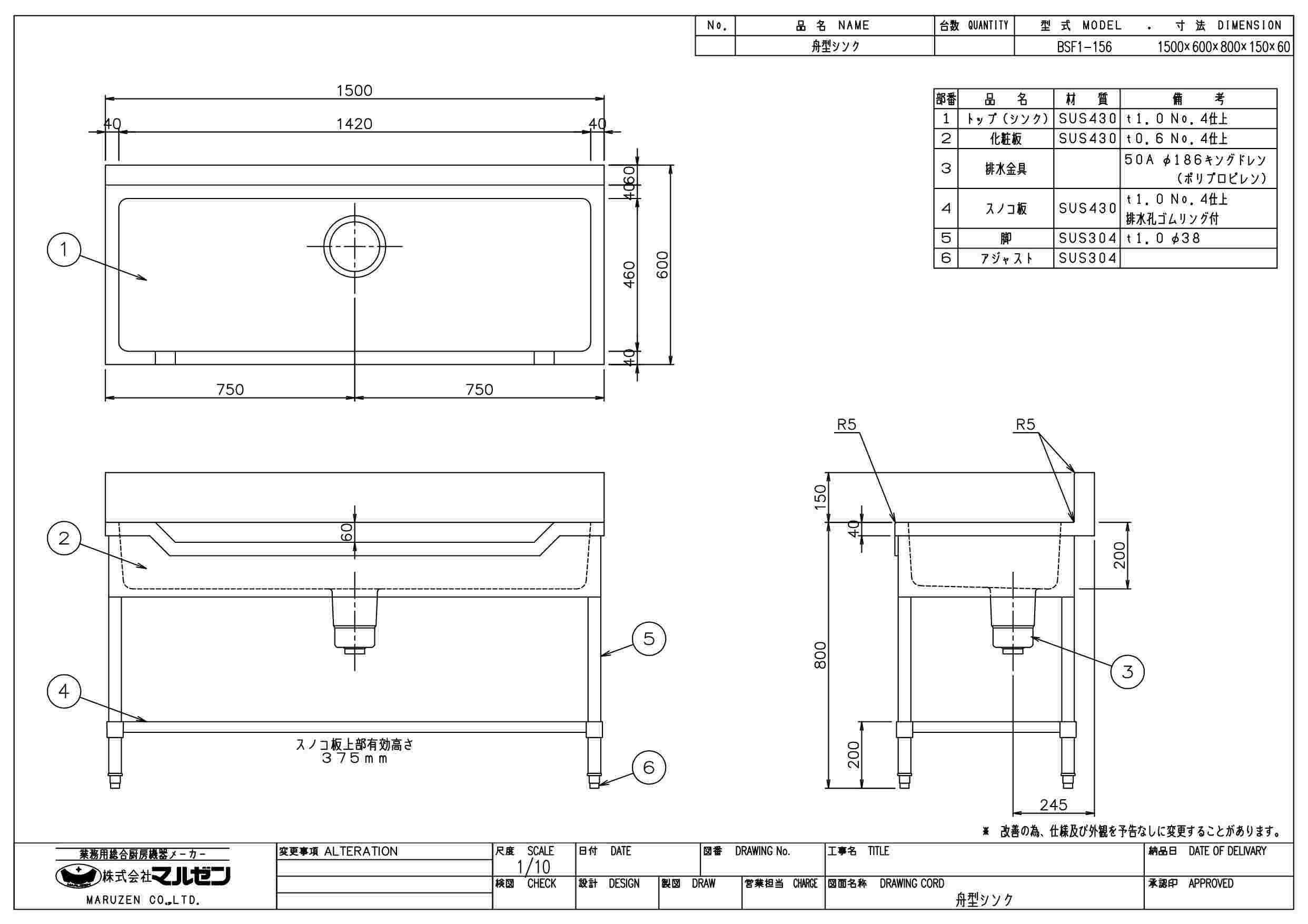 商品名:舟形シンク W1500×D600×H800